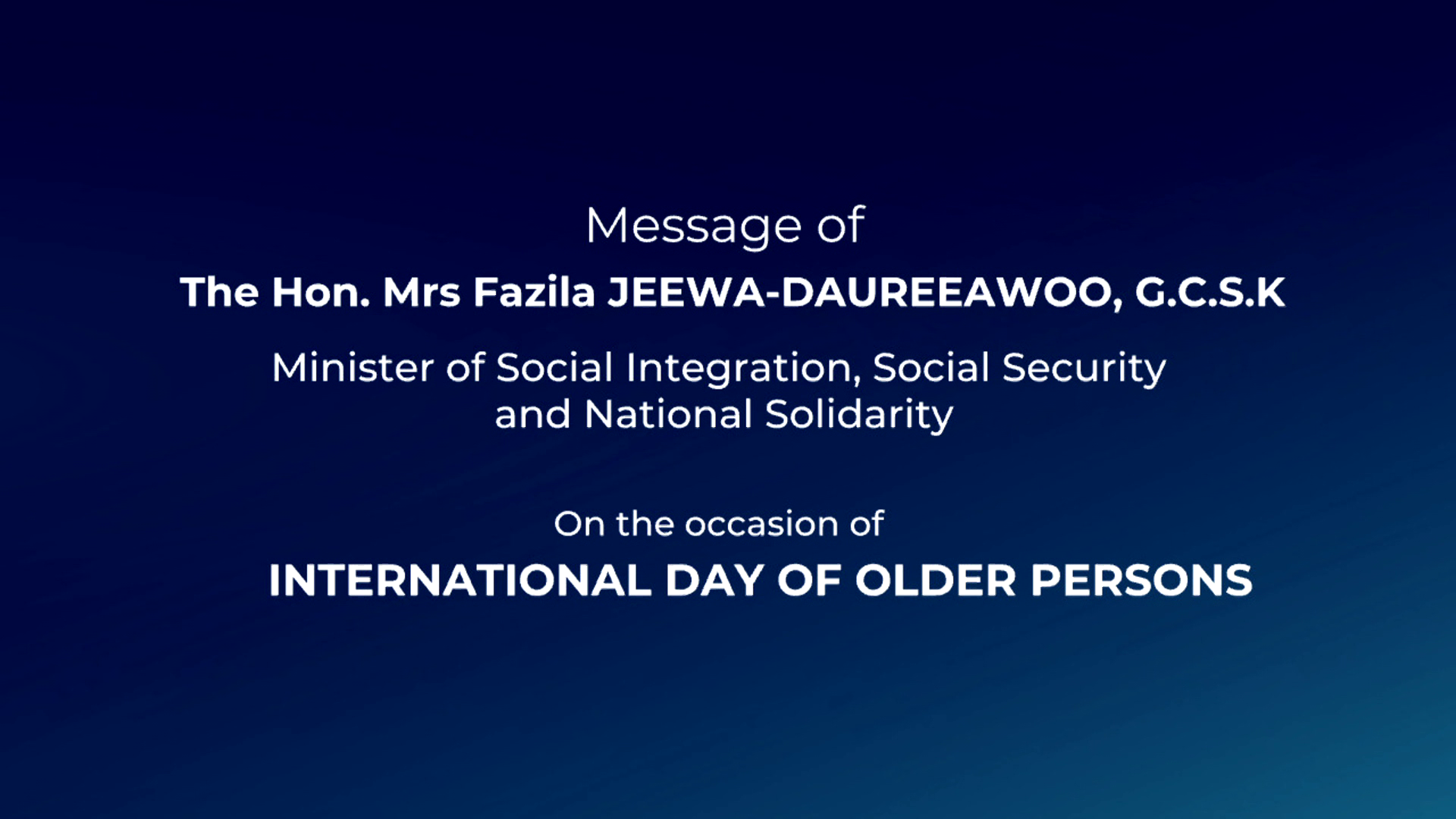 Oct 01, 2023 | Posted by mbc | 0 Message of The Hon. Mrs Fazila JEEWA-DAUREEAWOO, G.C.S.K, Minister of Social Integration, Social Security, and National Solidarity on the occasion of INTERNATIONAL DAY OF OLDER PERSONS View the discussion thread.