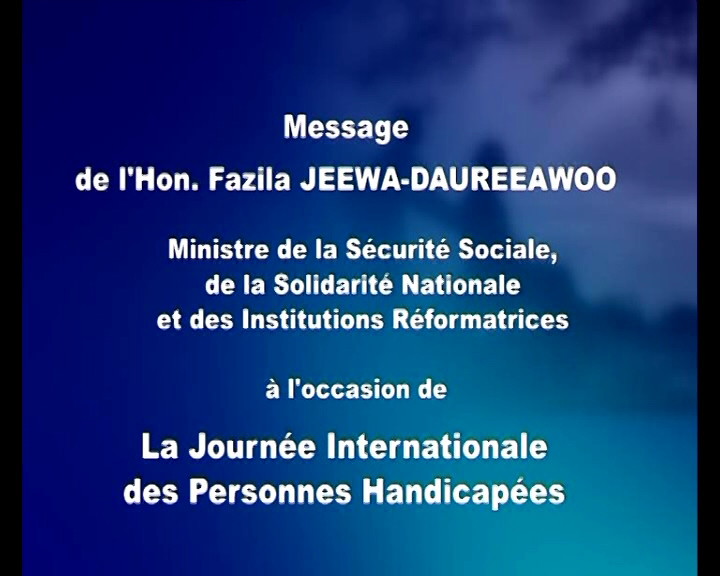 Dec 02, 2015 | Posted by mbc | 0 Message de L'hon Fazila JEEWA-DAUREEAWOO, Ministre de la sécurité Sociale, de la solidarité nationale et des institutions réformatrices à l’occasion de la journée internationale des personnes handicapées View the discussion thread.