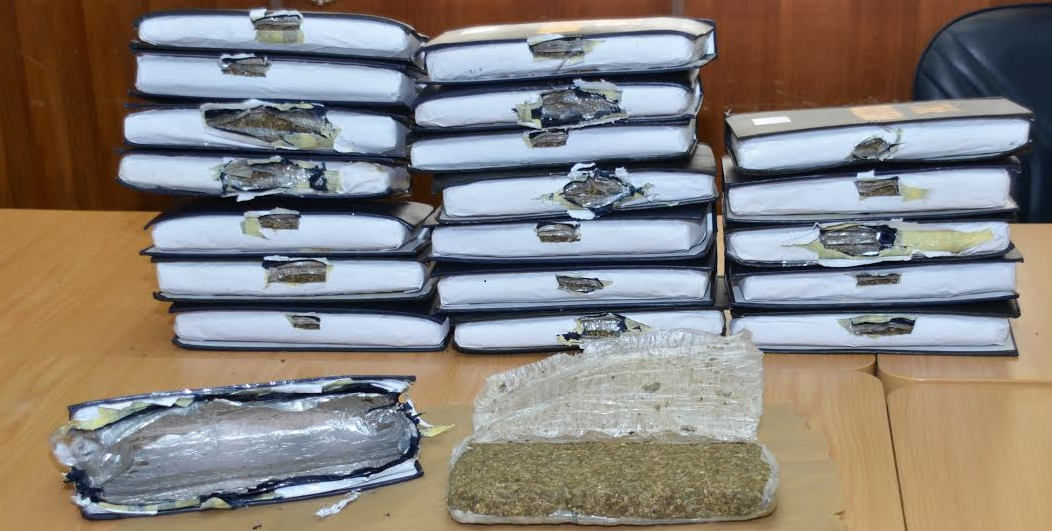 Apres avoir découpé ces couvertures de livre, une quantité conséquente de Cannabis compressé enroulé dans du papier carbone, des feuilles d’aluminium et des sacs en plastique furent découverte.